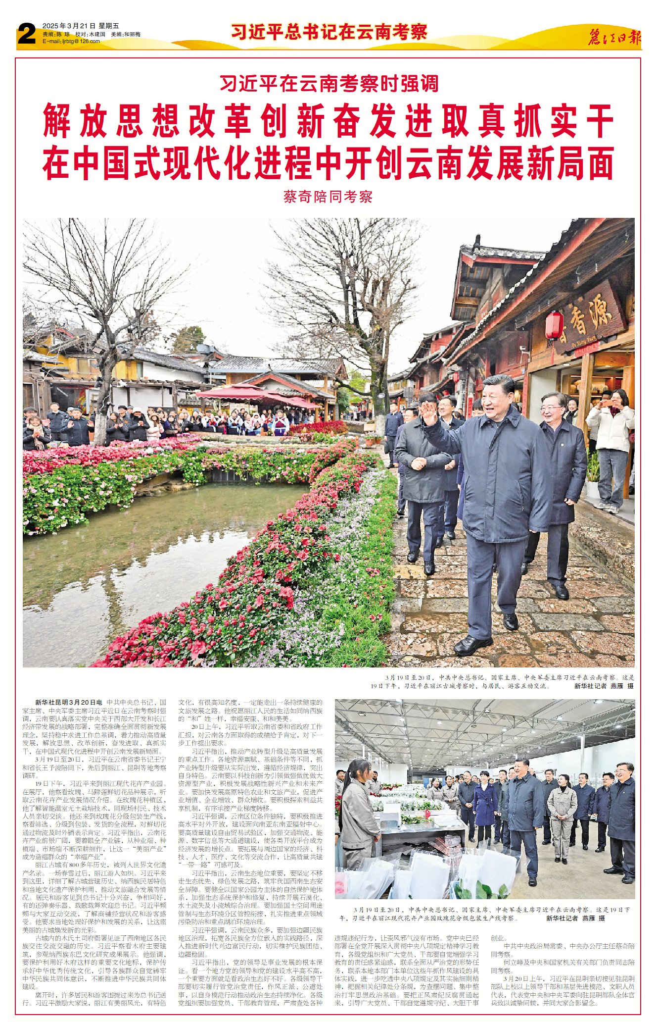 新华社昆明3月20日电 中共中央总书记、国家主席、中央军委主席习近平近日在云南考察时强调,云南要认真落实党中央关于西部大开发和长江经济带发展的战略部署,完整准确全面贯彻新发展理念,坚持稳中求进工作总基调,着力推动高质量发展,解放思想、改革创新,奋发进取、真抓实干,在中国式现代化进程中开创云南发展新局面。