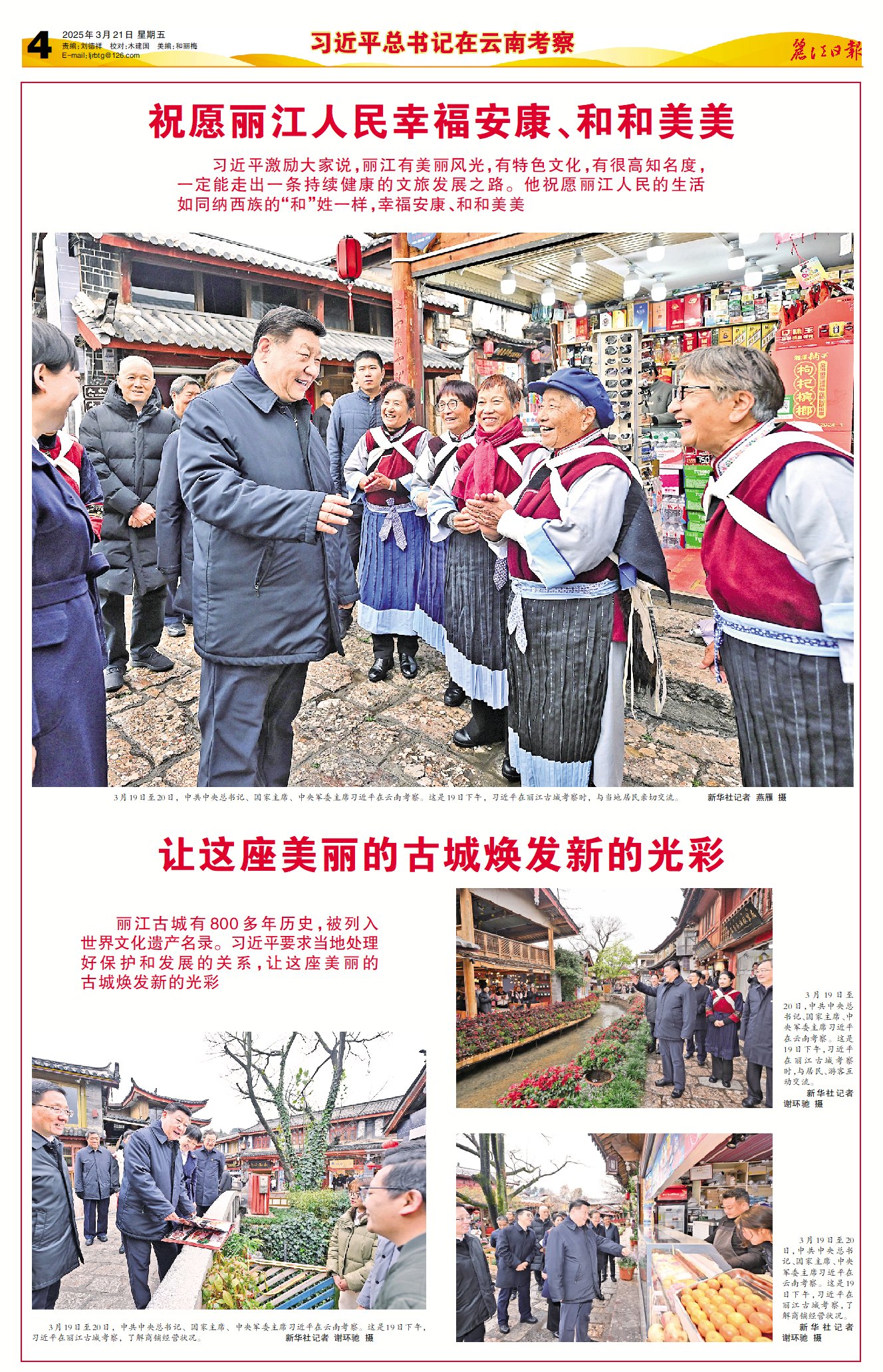 习近平激励大家说,丽江有美丽风光,有特色文化,有很高知名度,一定能走出一条持续健康的文旅发展之路。他祝愿丽江人民的生活如同纳西族的“和”姓一样,幸福安康、和和美美