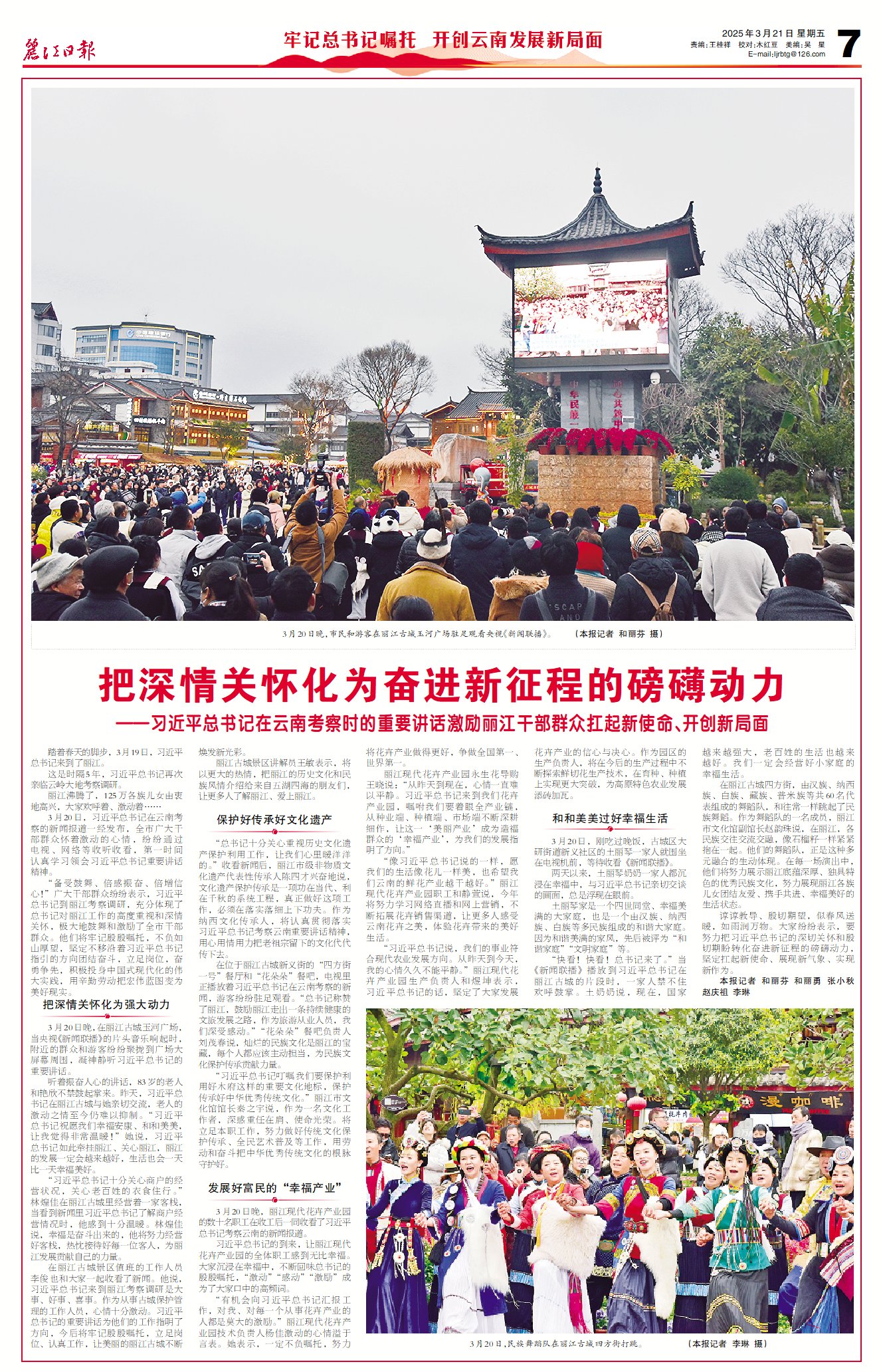 听着振奋人心的讲话,83岁的老人和艳欣不禁鼓起掌来。昨天,习近平总书记在丽江古城与她亲切交流,老人的激动之情至今仍难以抑制。“习近平总书记祝愿我们幸福安康、和和美美,让我觉得非常温暖!”她说,习近平总书记如此牵挂丽江、关心丽江,丽江的发展一定会越来越好,生活也会一天比一天幸福美好。