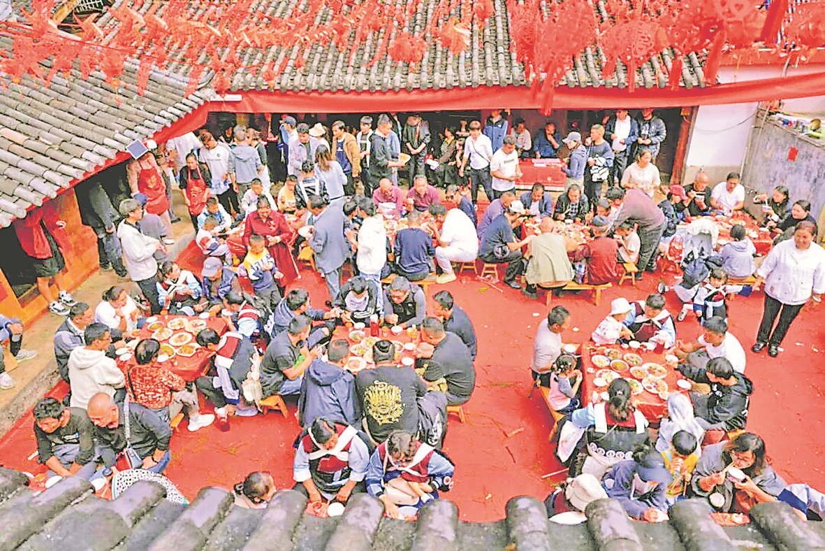 冬日也是喜事扎堆的时节。走在大街小巷,时常能遇见迎亲队伍,鞭炮跳落满地碎红,孩童追着队伍跑,手里攥着刚讨来的喜糖,笑声清亮如铃。婚宴上,八盘四碗摆满桌。粉蒸肉肥而不腻、酥肉金黄酥脆、百合圆子软糯香甜,还有腊肉、土鸡、时鲜蔬菜,每一道菜都透着地道的丽江风味。夜幕降临,院中篝火熊熊燃起,木柴噼啪作响,火光映亮每一张笑脸。穿着民族服饰的人们,手拉着手围成圈打跳,用歌舞传递祝福,暖意直抵心间。