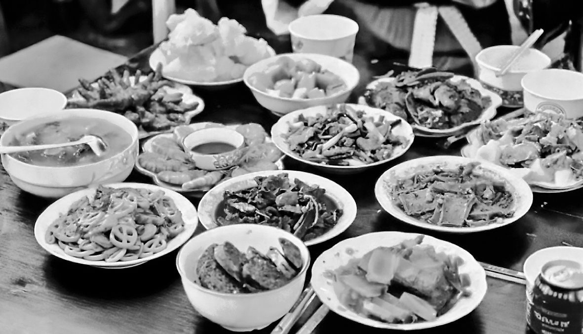手起刀落间,温热的猪血缓缓流入瓷盆。阿妈趁着猪血还未凝固,迅速加入盐巴搅拌均匀,这是制作米灌肠的上好原料。壮汉们用滚烫的开水浇淋猪身,铁刮子在猪身上来回刮擦,原本灰黑的猪皮渐渐变得白净光滑。处理好的猪肉被分成一块块:瘦肉用来做腊肉,肥肉炼成猪油,内脏则将做成一桌丰盛的“杀猪菜”。