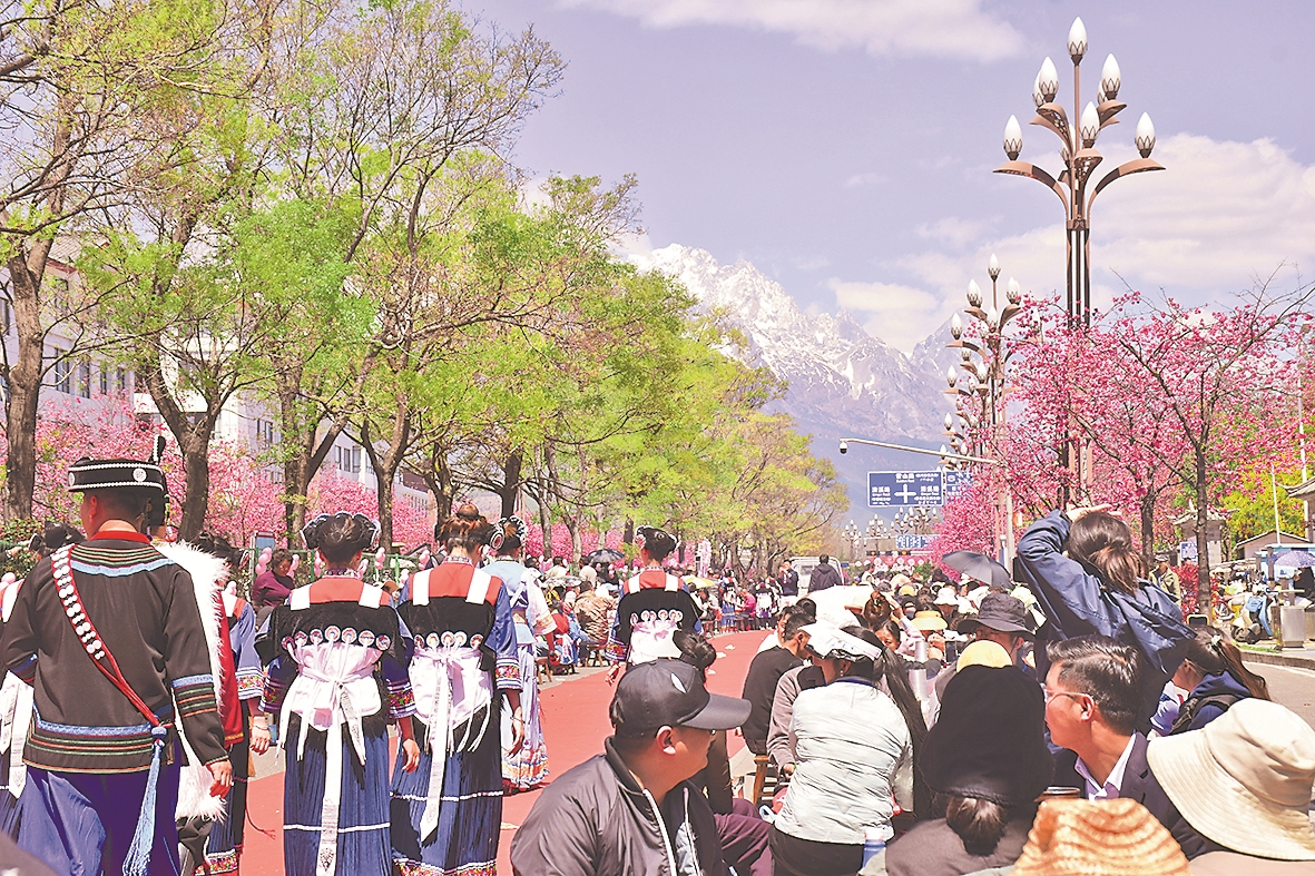 3月26日,位于丽江城区的雪山路樱花大道热闹非凡。百余米长街宴依路而设,餐桌正对玉龙雪山,传统火锅、腊排骨、鸡豆凉粉、米灌肠等美食悉数上桌,香气浓郁。身着民族服饰的群众与各地游客围坐长桌,共品美食、共庆佳节。非遗服饰秀、民族歌舞等节目依次上演,歌声、舞步与雪山风光、地道美食相映成趣,现场喜庆祥和,尽显民族团结、其乐融融的节日氛围。“现场能看到多民族服饰、风俗展示,让人既兴奋又震撼。”“新丽江人”王子说。陕西游客林守明表示,这样的活动让大家真正走进丽江人的生活,沉浸式感受这里独具魅力的民族风情。