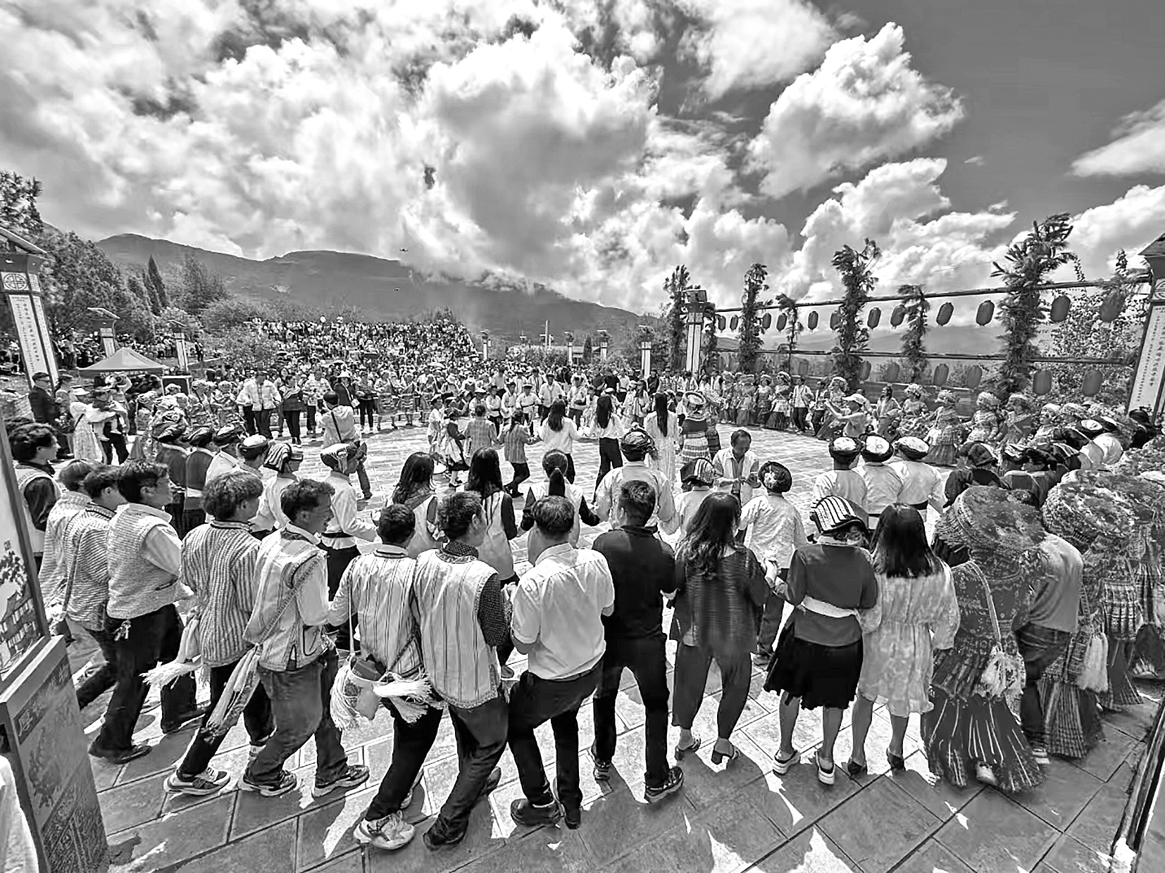 7月30日晚,在古城区大研街道文林村内,居民和外来经营户,以及众多市民和游客欢聚一堂,共同体验纳西族独特的民俗文化。