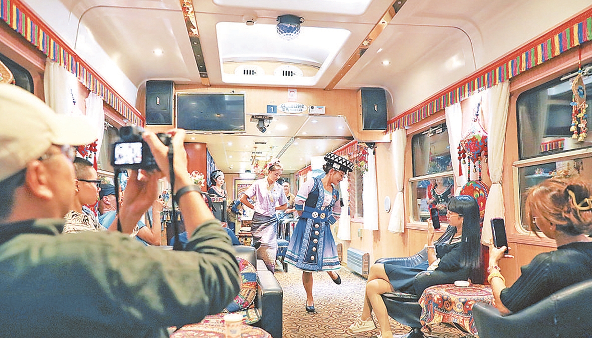1号车厢十分热闹。车厢连接部有一个民族服饰试穿打卡区,旅客正在试穿拍照。“车上免费提供佤族、傣族、彝族、白族等少数民族服装,供旅客试穿拍照,感受多彩的民族文化。”列车长冯南静说。