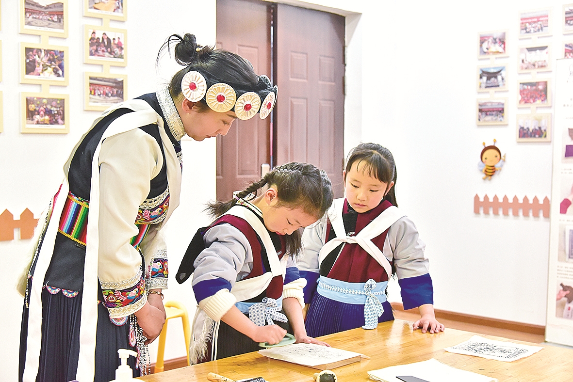 近日,小朋友在丽江东巴书院工作人员的指导下体验甲马印制。 (本报记者 李琳 摄)