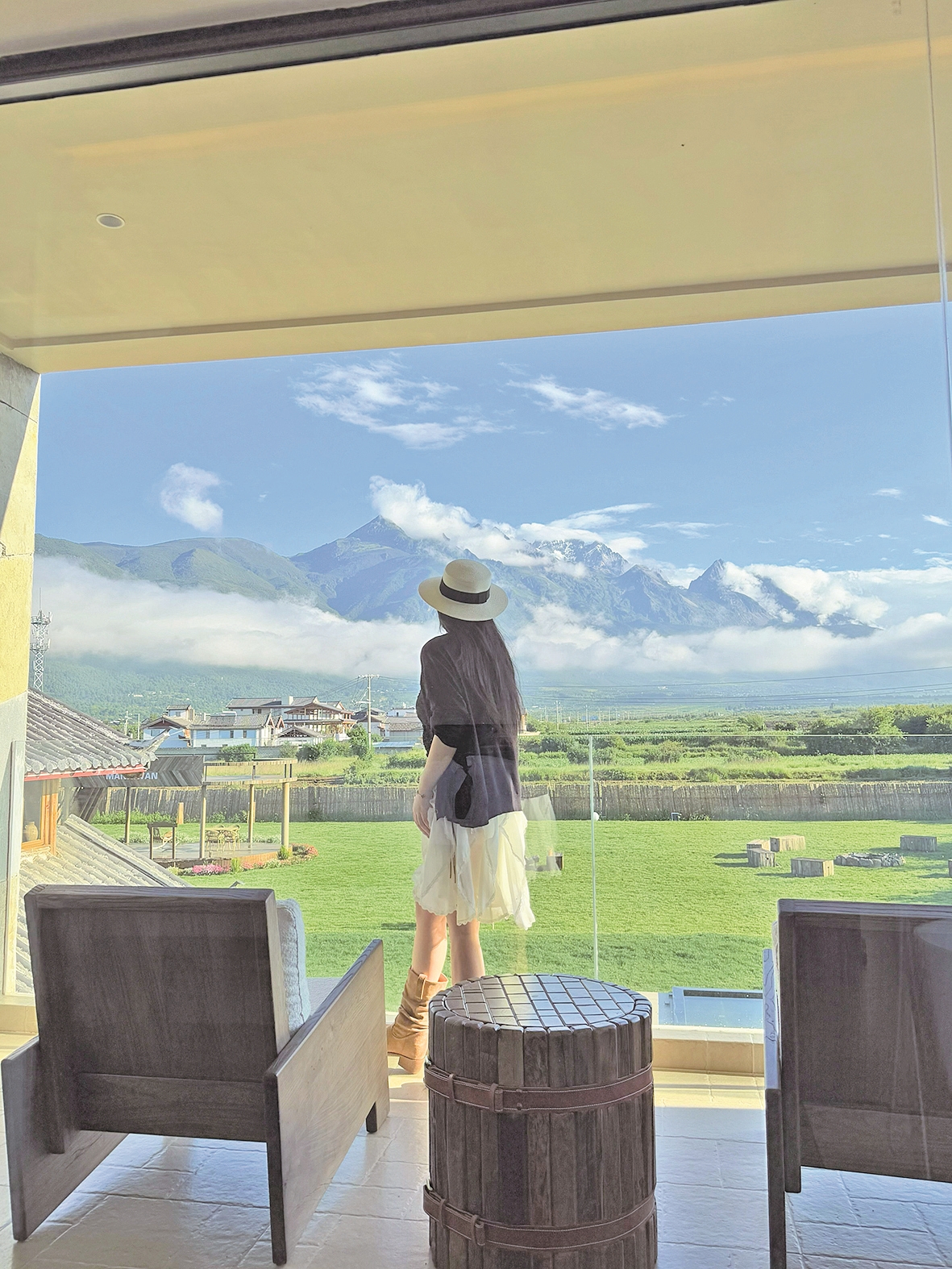 在玉龙县白沙镇新善村,一座静谧的小院悄然伫立,落地窗如精心设计的画框,将巍峨壮美的玉龙雪山“框”住。这里是“漫栖湾雪山·野奢民宿”,一个由“90后”女孩晏媛为客人精心打造的家。
