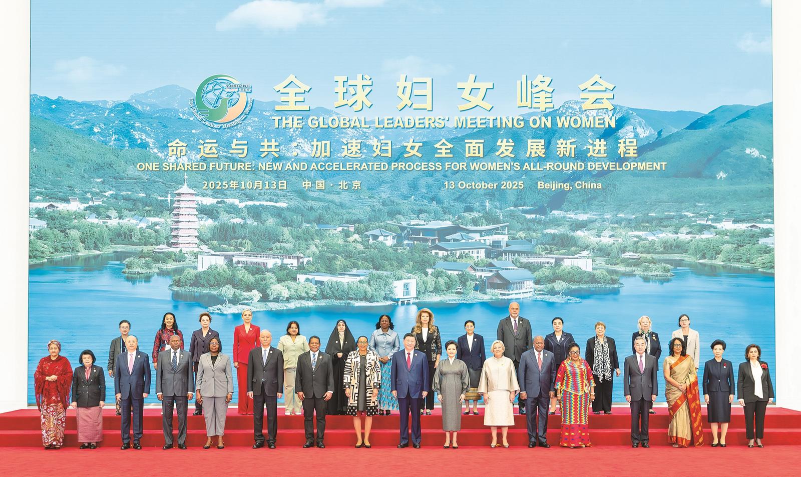 2025年10月13日上午,国家主席习近平在北京国家会议中心出席全球妇女峰会开幕式并发表主旨讲话。这是习近平和夫人彭丽媛同与会各国和国际组织代表团团长夫妇合影留念。 新华社记者 黄敬文 摄