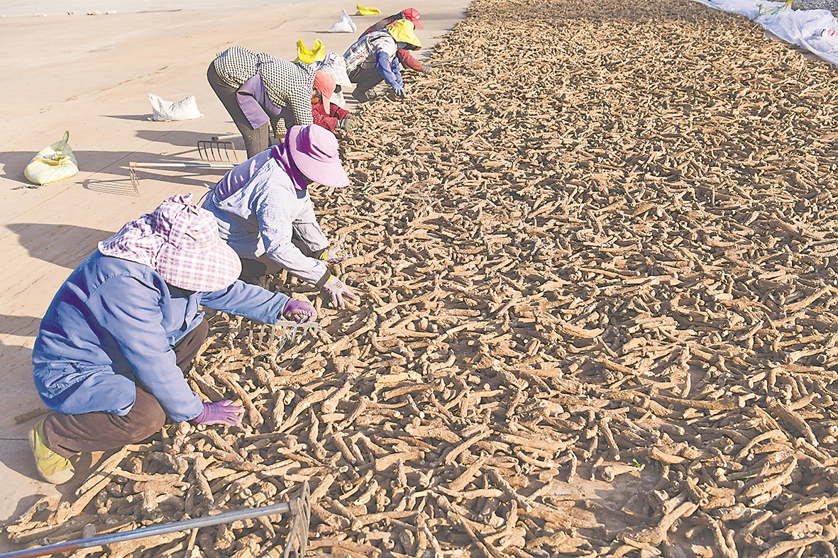 2月24日,工人在丽江得一食品有限责任公司中药材加工基地翻晒云木香。
