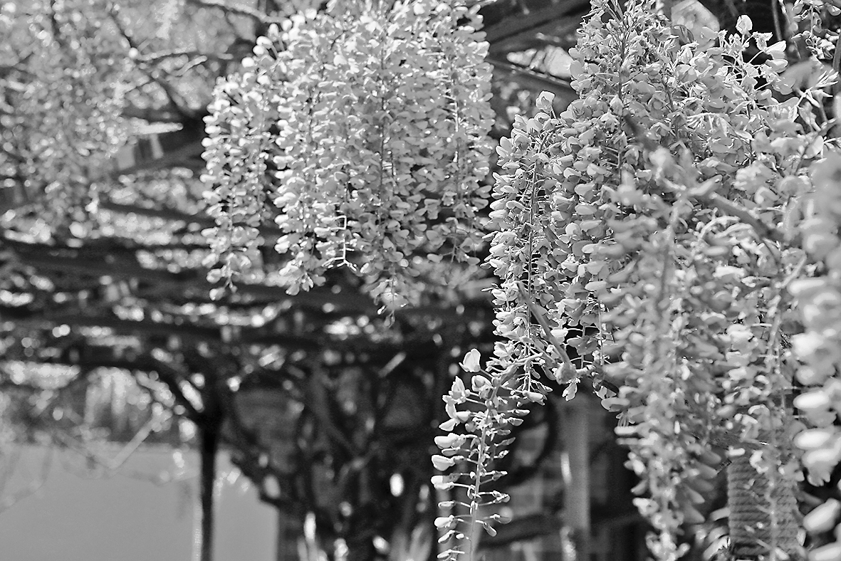 在木府,一串串饱满的紫藤花穗垂挂如帘。
