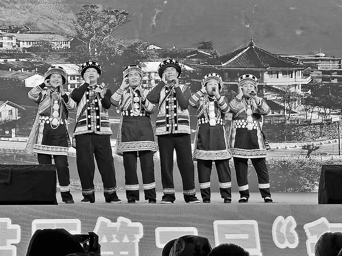 怒江州级非物质文化遗产代表性传承人祝兴三(右三)携团队进行非遗表演。